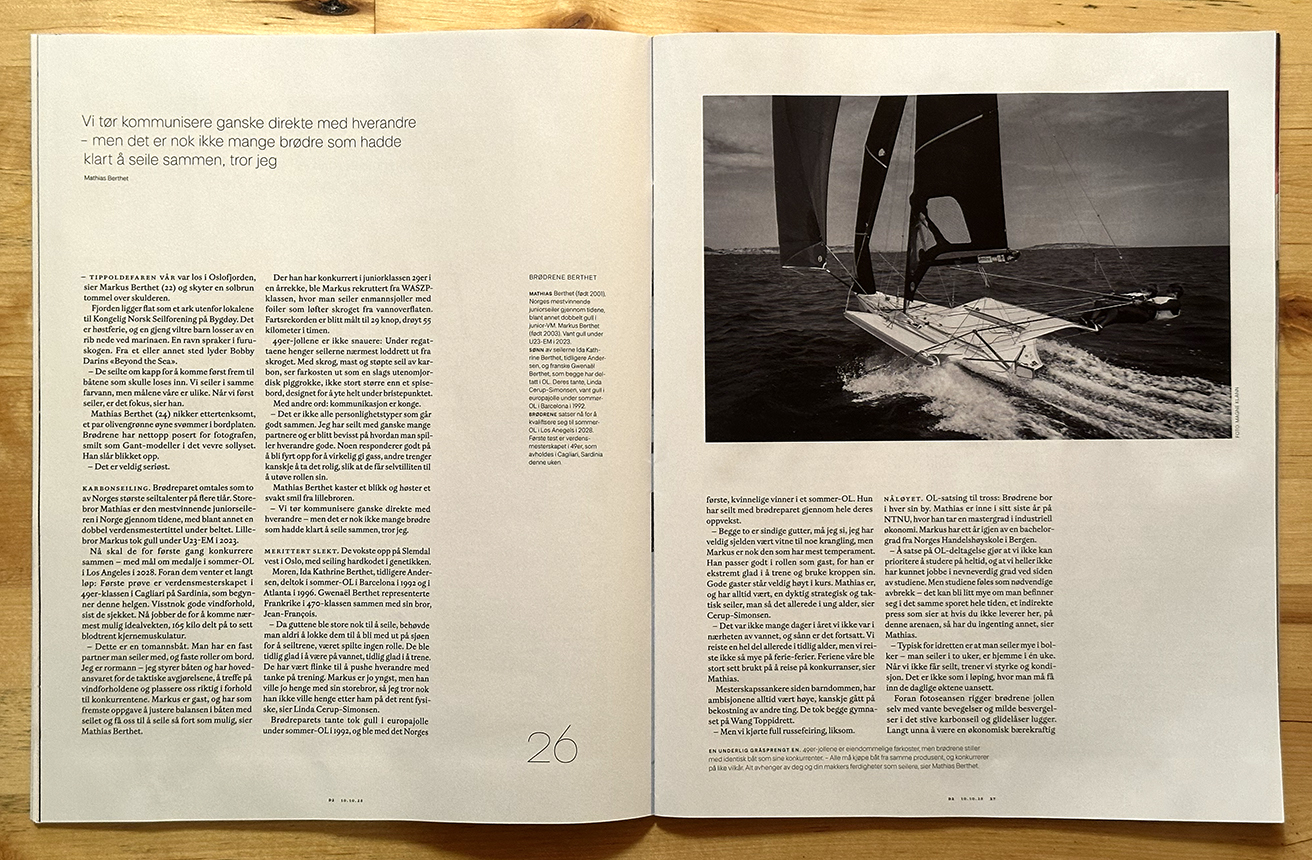 «Nå skal de for første gang konkurrere sammen – med mål om medalje i sommer-OL i Los Angeles i 2028. Foran dem venter et langt løp: Første prøve er verdensmesterskapet i 49er-klassen i Cagliari på Sardinia, som begynner denne helgen. Visstnok gode vindforhold, sist de sjekket. Nå jobber de for å komme nærmest mulig idealvekten, 165 kilo delt på to sett blodtrent kjernemuskulatur.»